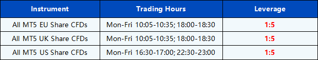 During these specific trading hours, MT5 Shares CFDs products leverage is fixed at 1:5 and additional margin is required to open any new positions. Once holding positions are no longer within the specified trading hours, the leverage will automatically restore to 1:20.