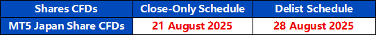 We would like to inform you that MT5 Japan Shares CFDs will be placed under Close-Only mode starting 21 August 2025 and expected to be delisted from the tradable product list on 28 August 2025.